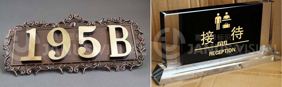 酒店標識牌是一種應(yīng)用于酒店的廣告標牌。酒店標識系統(tǒng)是根據(jù)酒店整體設(shè)計風格為導(dǎo)向,綜合解決酒店方向性引導(dǎo),視覺識別等運行功能為前提配合酒店整體工程項目實施的其中一部分工程。主要用以突出酒店的風格特色,主要制作材質(zhì)以紅木、金屬(銅、鐵、鋁、錫、鈦金、不銹鋼)為主,制作工藝較為復(fù)雜,選用材質(zhì)也很多。按照功能來劃分,酒店標牌分大堂指示牌(如收銀)、樓層指示牌、門號牌、功能指示牌、時鐘指示牌、告示牌、房價牌、外幣兌換牌等。